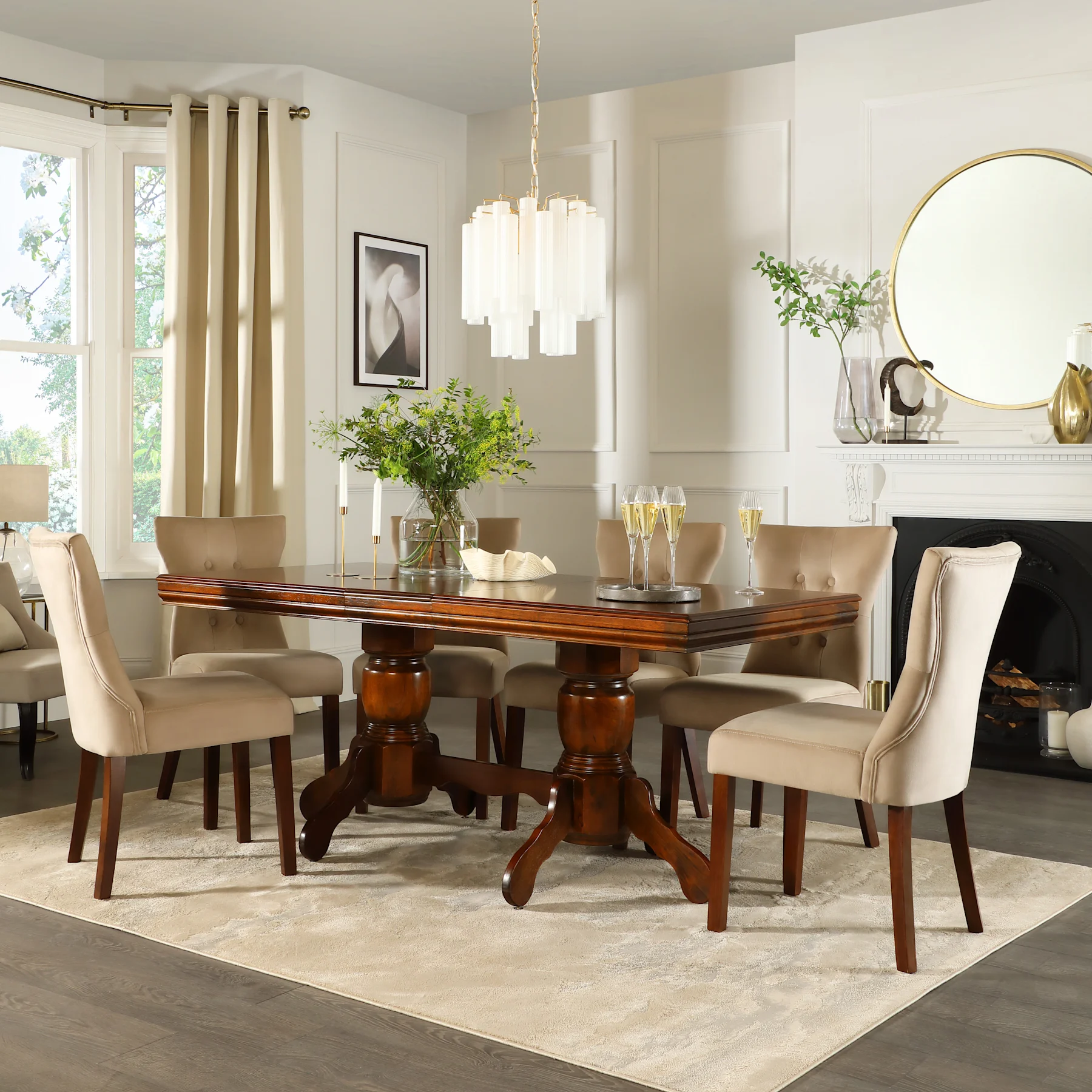 Complete the look with a set of handsome dining chairs. For a matching set, you won't go wrong with dark wood dining chairs, or you could choose from comfortable fabric options for a more casual vibe.