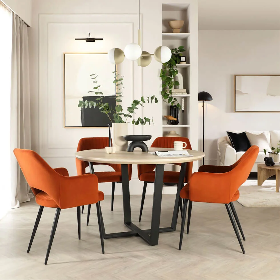Pink is often thought of as light-hearted, but it also invites you to lean into your glamorous side. If you have wall panelling, pink emphasises this element. When it comes to choosing a dining set, go for a marble or chrome finish for the dining table to highlight the contrast. Soften with velvet or plush fabric upholstery to complete the look.