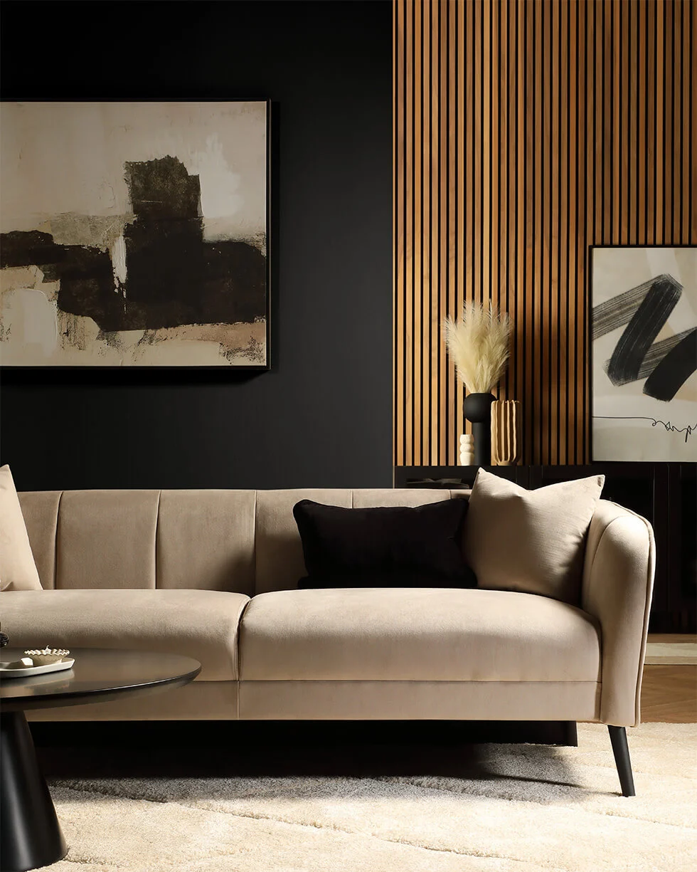 The great thing about black is that it pairs beautifully with just about every colour — it’s up to you what mood or vibe you would like to set for your living room. It also goes well with a variety of interior styles like industrial, Art Deco interiors, Scandi interiors, minimalism, classic interiors and contemporary luxe.