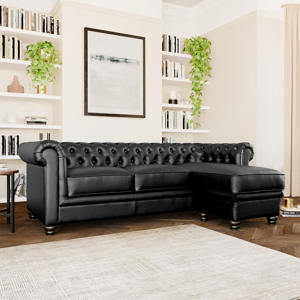 A black Chesterfield sofa is a timeless choice and serves as a calming anchor in a black living room. To make it stand out in your living room, it’s all about choosing the right upholstery. Faux leather or velvet helps emphasise its rolled arms, low back and button-tufted silhouette, immediately drawing attention to these details.