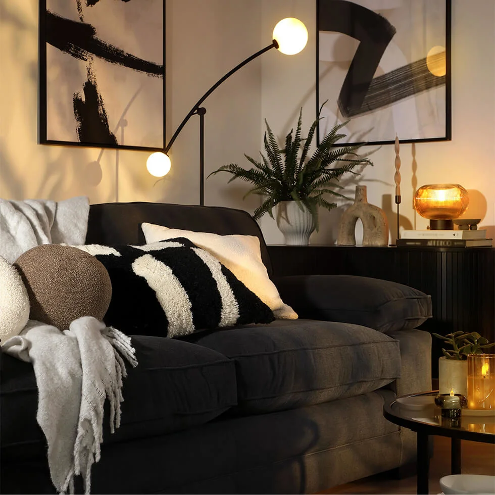 If you’re worried that black will make the room feel cold and uninviting, it’s a good idea to bring in lighter accents like white, cream and grey. Create a layered look on the sofa with throws or cushions – the key is to be eclectic when accessorising to make it feel homely. Pile on the textures like plush fabric, faux fur or cotton when layering.