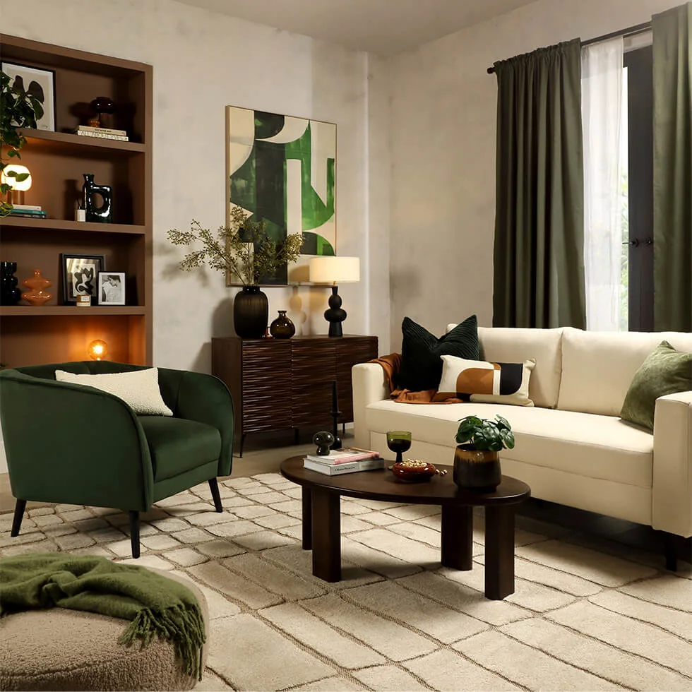 Brown is all the rage now and it’s the perfect way to introduce earthy colours to your living room. If you want to introduce it as a wall colour, choose muted tones like beige, camel or latte for that luxe feel. You can also decorate with different brown tones, such as using dark browns to accentuate specific parts of the room, like the shelving in an alcove. Besides the wall colour, choose a sofa in a light brown tone or go even lighter with a cream or oatmeal tone. To prevent the room from feeling one-dimensional, bring in other earth tones like terracotta, orange or rust through soft accessories like cushions or throws.