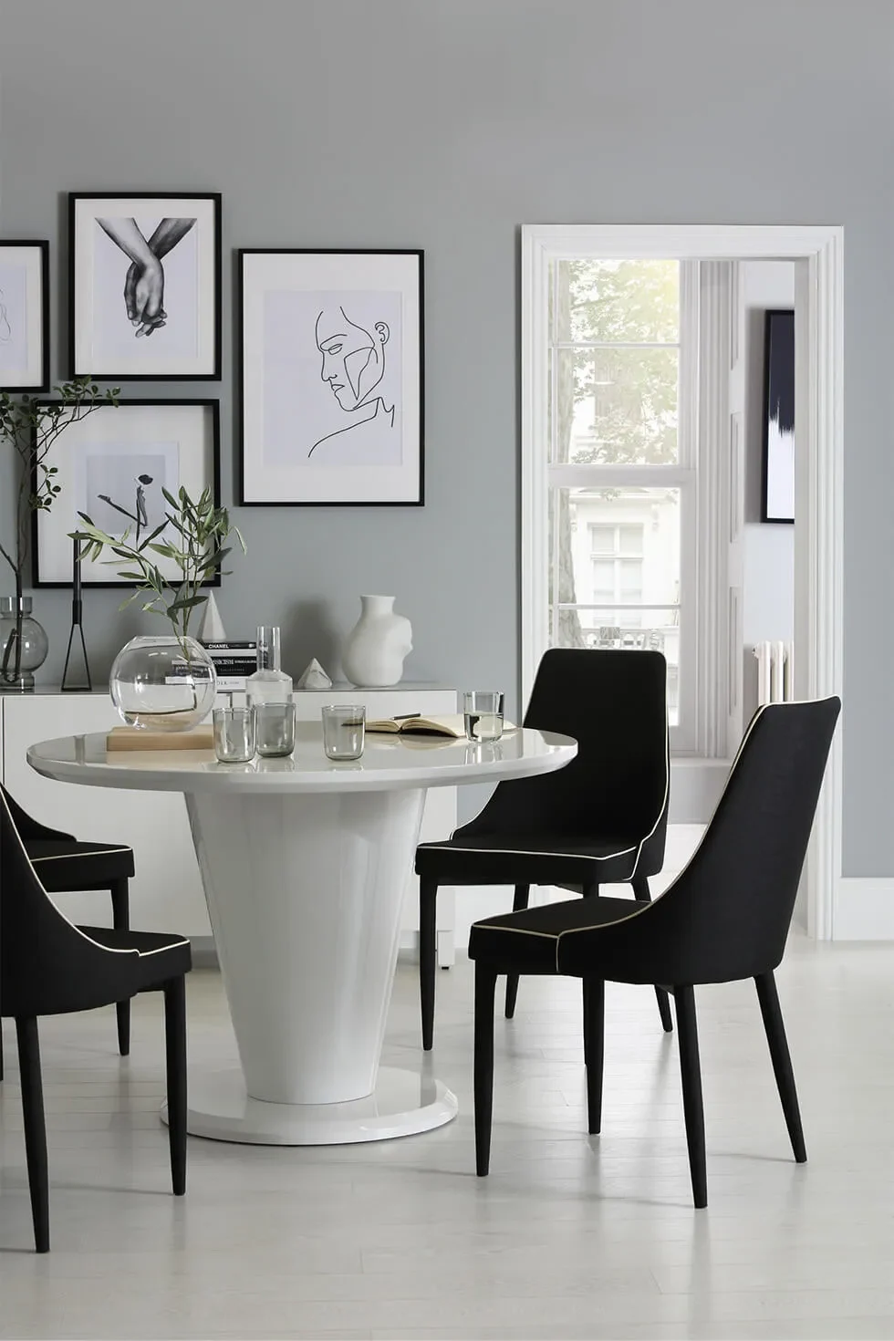 On the other hand, going for black furniture doesn’t necessarily mean going big. For example, pairing black fabric chairs with a white dining table creates a sophisticated yet understated look. Complement the dining set with a gallery wall featuring black and white artwork or black frames.