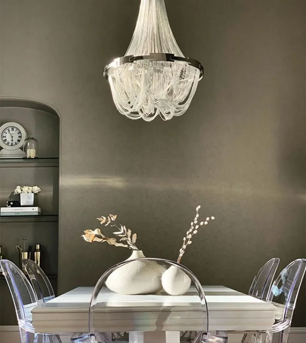 Victoria switched things up by pairing the Chatsworth with six timeless Kartell Louis Ghost chairs that she’s had for the past decade. Together with the abstract cobweb pattern wallpaper in the background from Harlequin, the room has a strong intimate feel. And, with a few gorgeous ceramic vases from Kelly Hoppen Home, it creates a sophisticated and layered look with its subtle paper-effect.