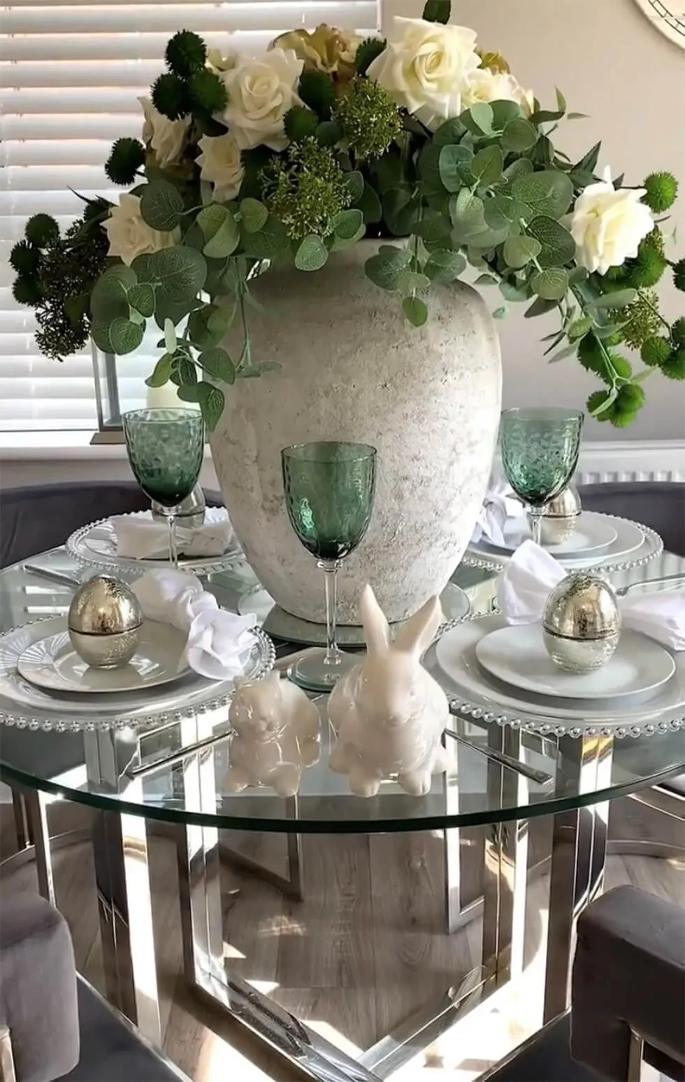For her dining area, Charlie chose a round glass and chrome dining set - a luxe backdrop for an inviting tablescape. “I love to play with height when creating a tablescape using a large vase and flowers as a centrepiece combined with candle sticks, tea lights and even lanterns,” she says. “Quite often I’ll use coloured wine glasses and foliage on the table to create a theme.”