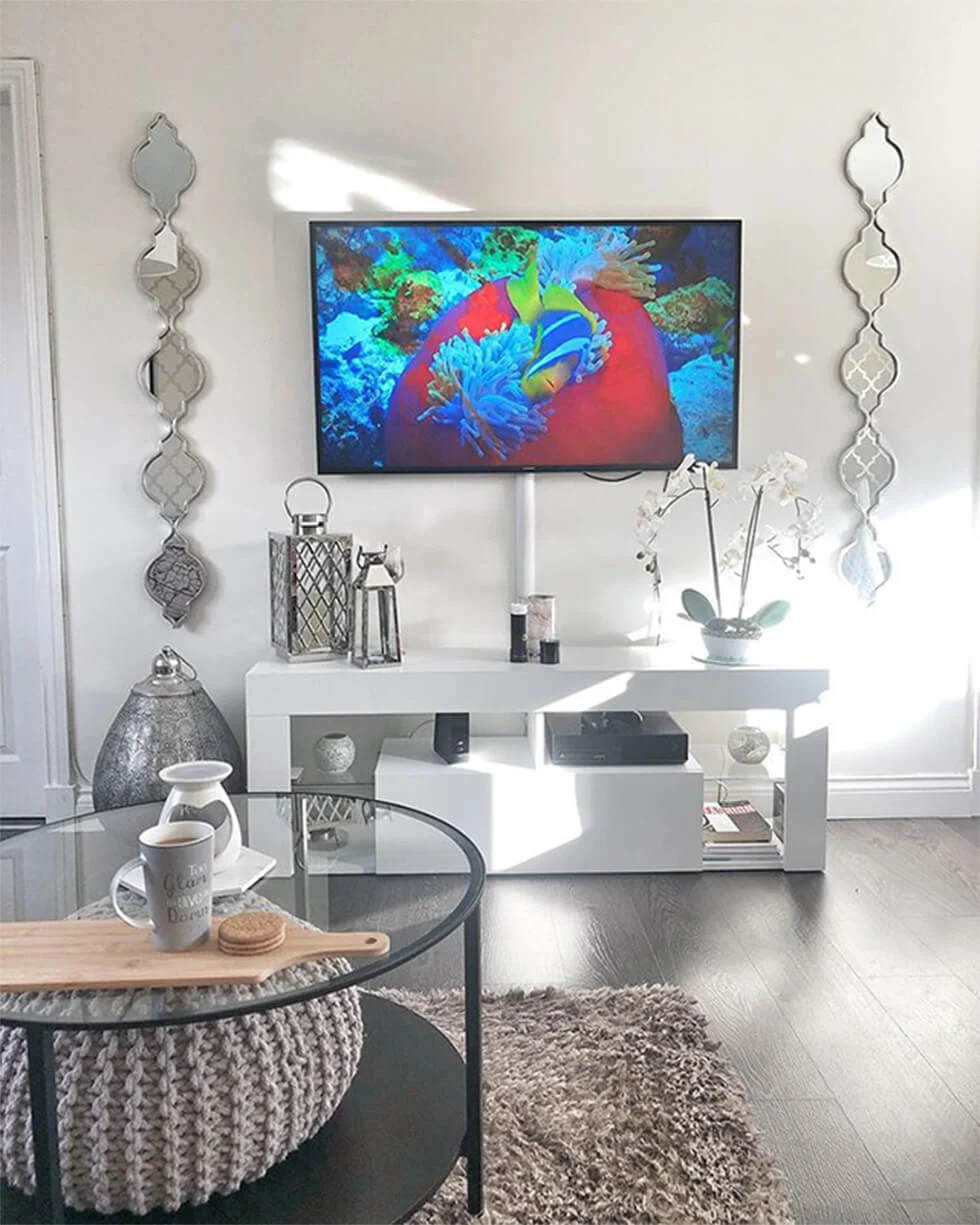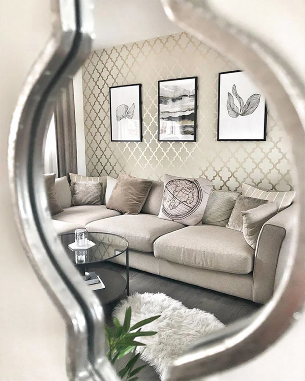 Two beautiful quatrefoil mirrors in a silver finish flank her TV, reflecting the cream and gold wallpaper on the opposing wall. “I really love my living room mirrors. They are such an unusual shape and they complement my wallpaper so well.” When mixing metals, maintain coherence in other aspects like pattern or silhouette, like how Claire does here.