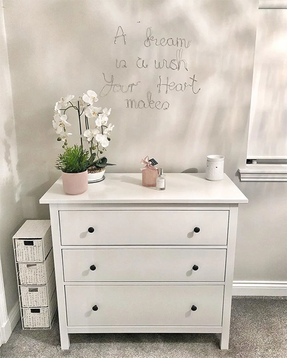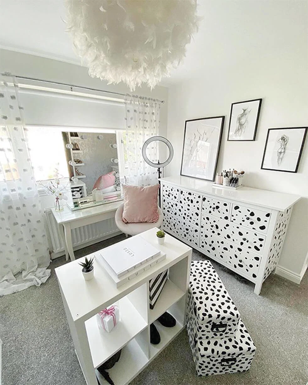 For instance, she reused the Dalmatian wall decals that were on her old makeup room walls and strategically placed them on her Ikea Hemnes dresser to give it a completely different look. It’s now one of her favourite pieces of furniture.