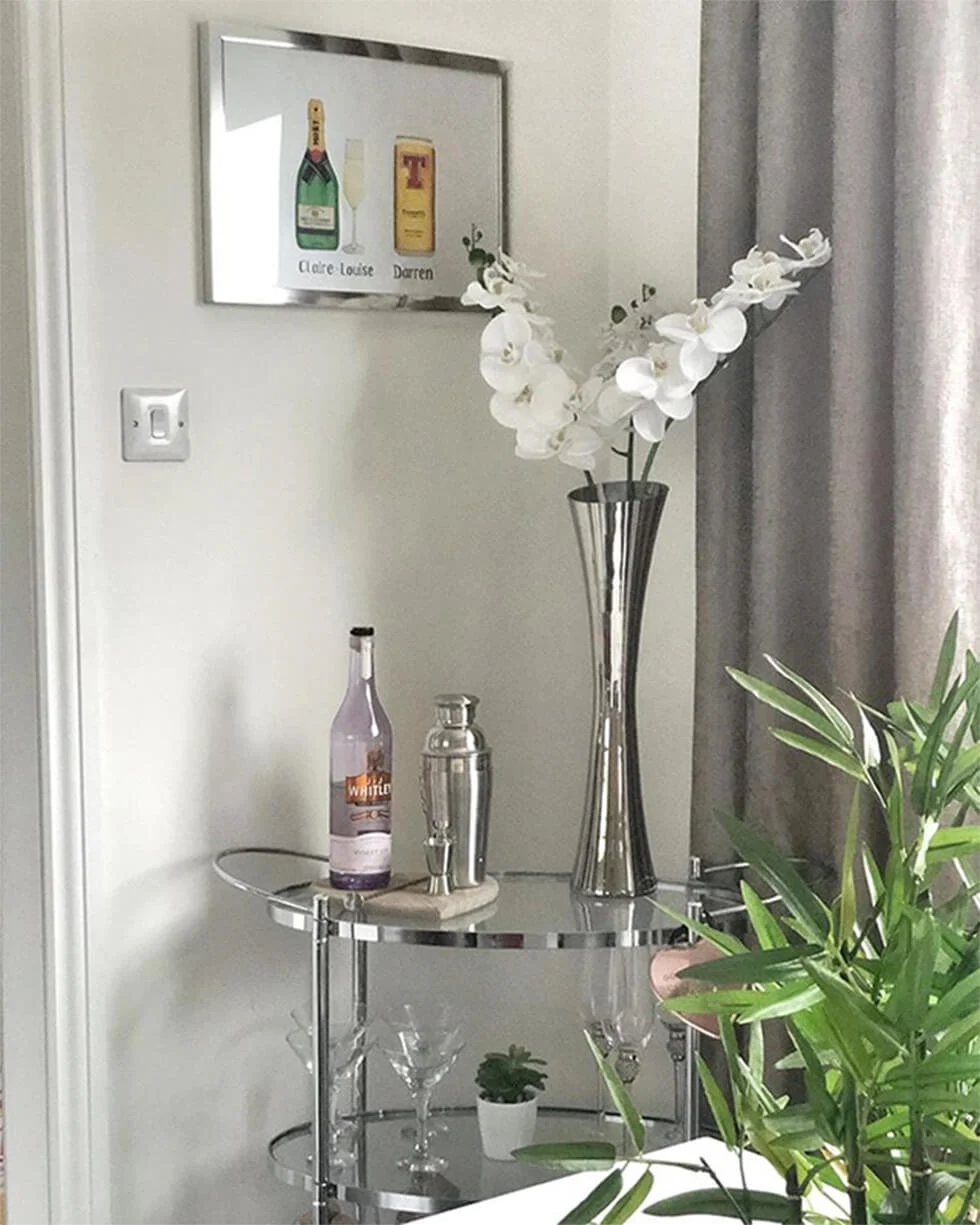 If you love entertaining or mixing drinks, setting up a nifty bar cart is not only convenient but a way to show off that side of you as well. Claire styles her bar cart simply, parking it in a corner beneath a sweet illustration of her and her partner’s favourite drinks. Cool, personalised artwork aside, it’s great as a conversation starter too!