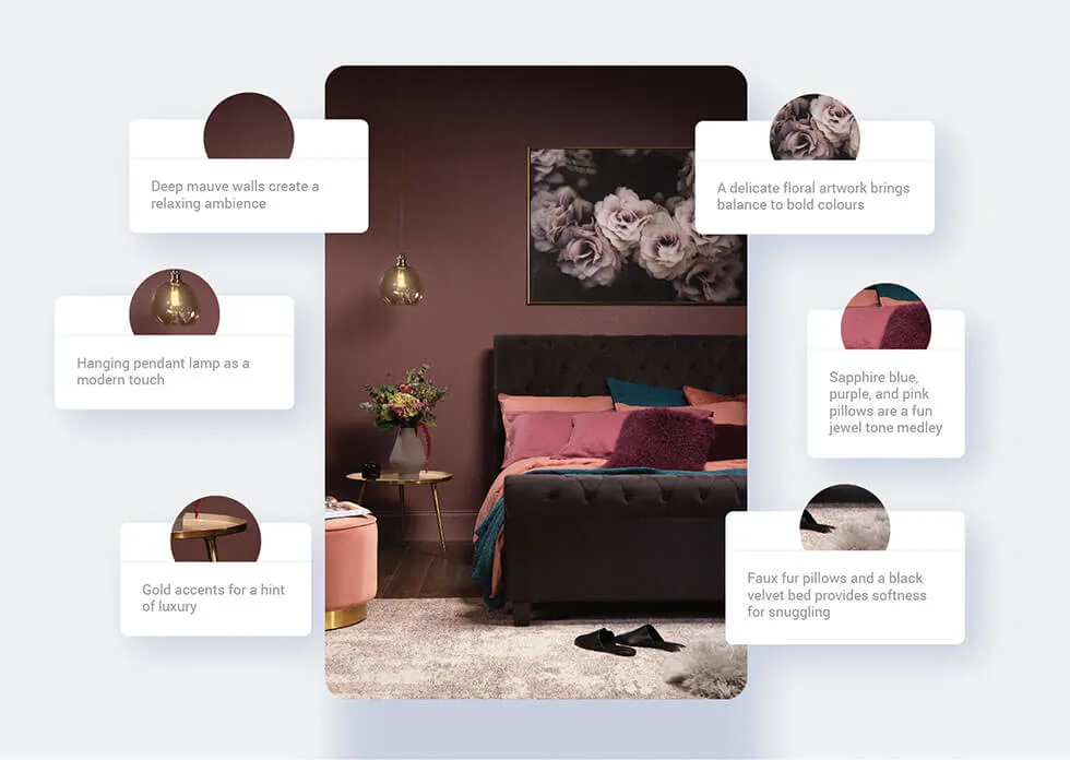 Relaxing and welcoming, a deep mauve bedroom is a respite for screen-tired eyes. Layer elegant jewel tones like sapphire blue, amethyst purple and morganite pink to evoke a deeply soothing atmosphere that still shines with major style points.