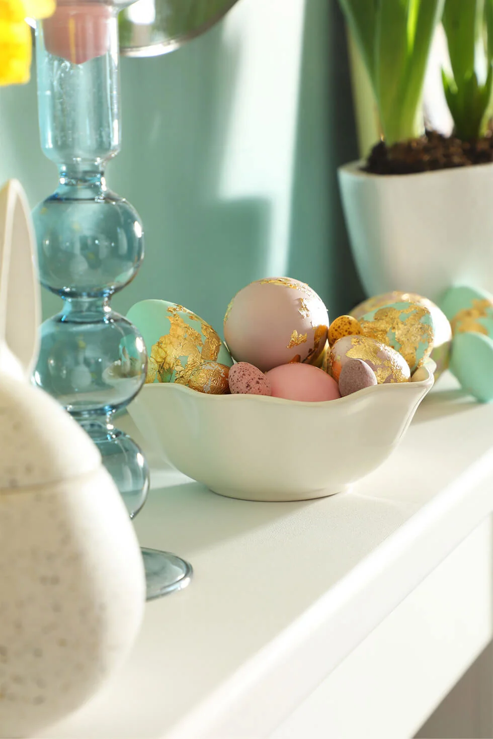 Display colourful eggs for a curated Easter look. Choose from an array of pastel hues for that refreshing spring feel. And for that extra luxe touch, coat the eggs in gold leaf paint.