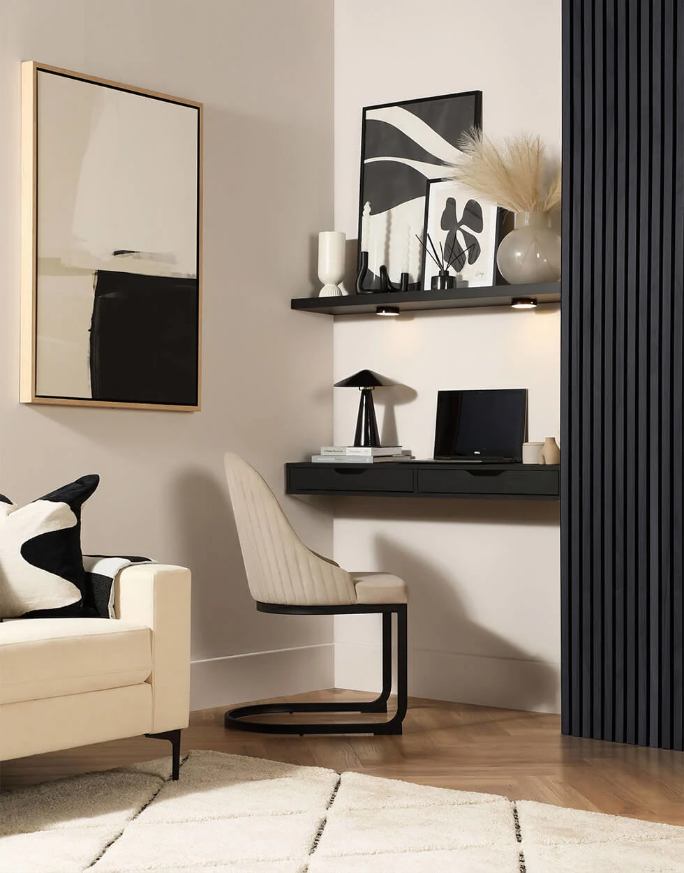 Aside from hanging artwork and being used for practical shelving, walls also make an excellent space-saver. Positioning your table next to a wall is a great solution in establishing a cosy working spot without taking up too much room.