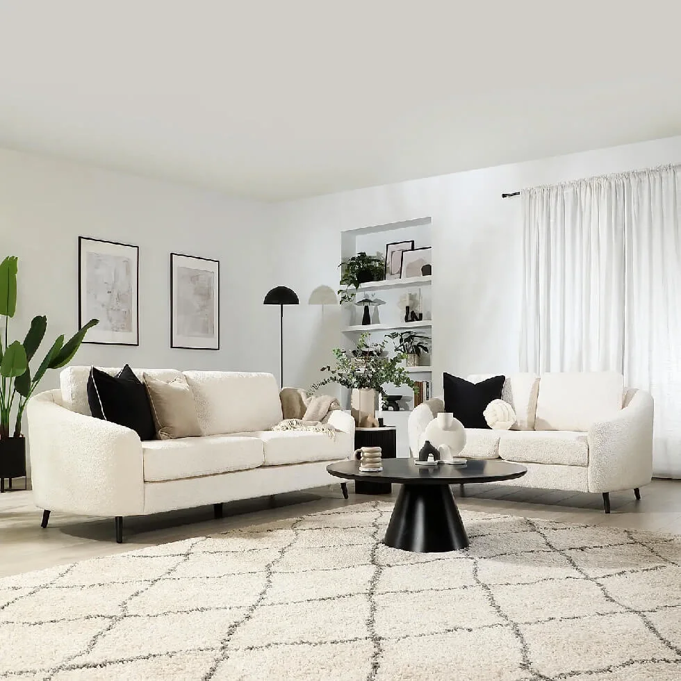 Yes, grey and white are a classic colour combination for a white living room. You can introduce grey as a sofa colour to complement white walls or through accessories like a rug, cushions or throws.