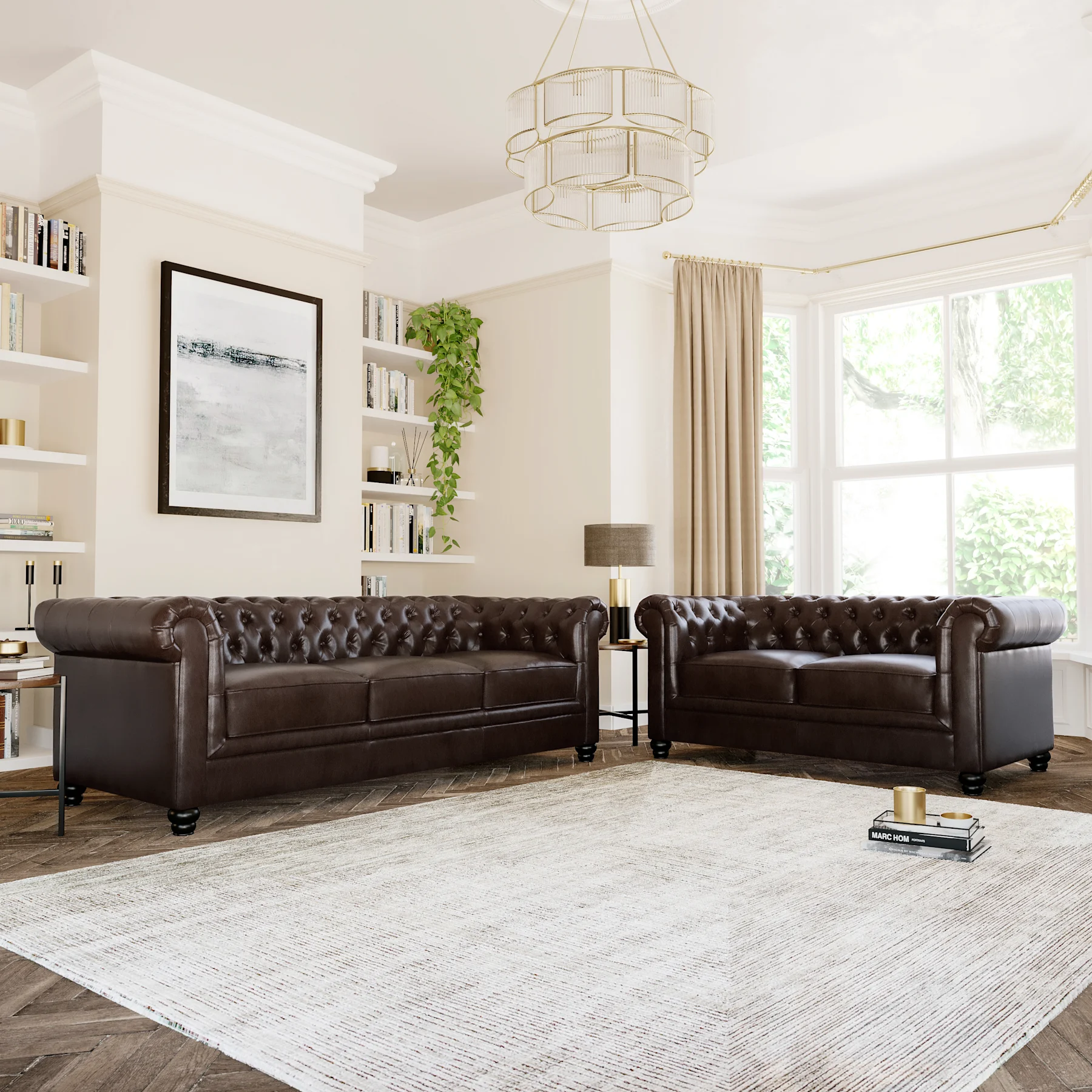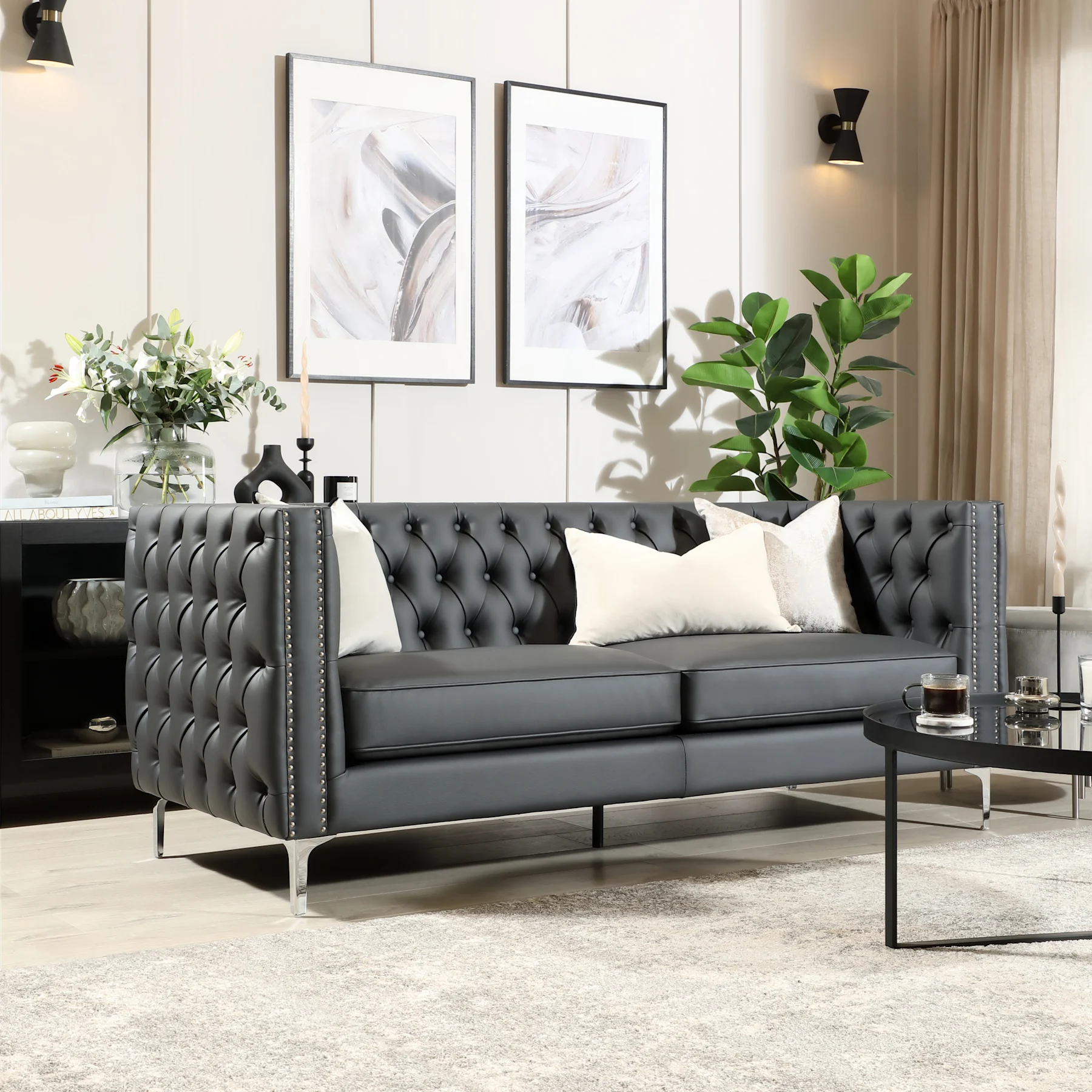 Timeless, elegant and always in style - elevate your living space with our range of faux leather Chesterfield sofas. Crafted with attention to detail, each sofa oozes charm and sophistication without compromising on durability. The tufted backrest and rolled arms create a regal look, perfect for both modern and classic interiors. Treat yourself to the ultimate lounging experience with a faux leather Chesterfield sofa, here.