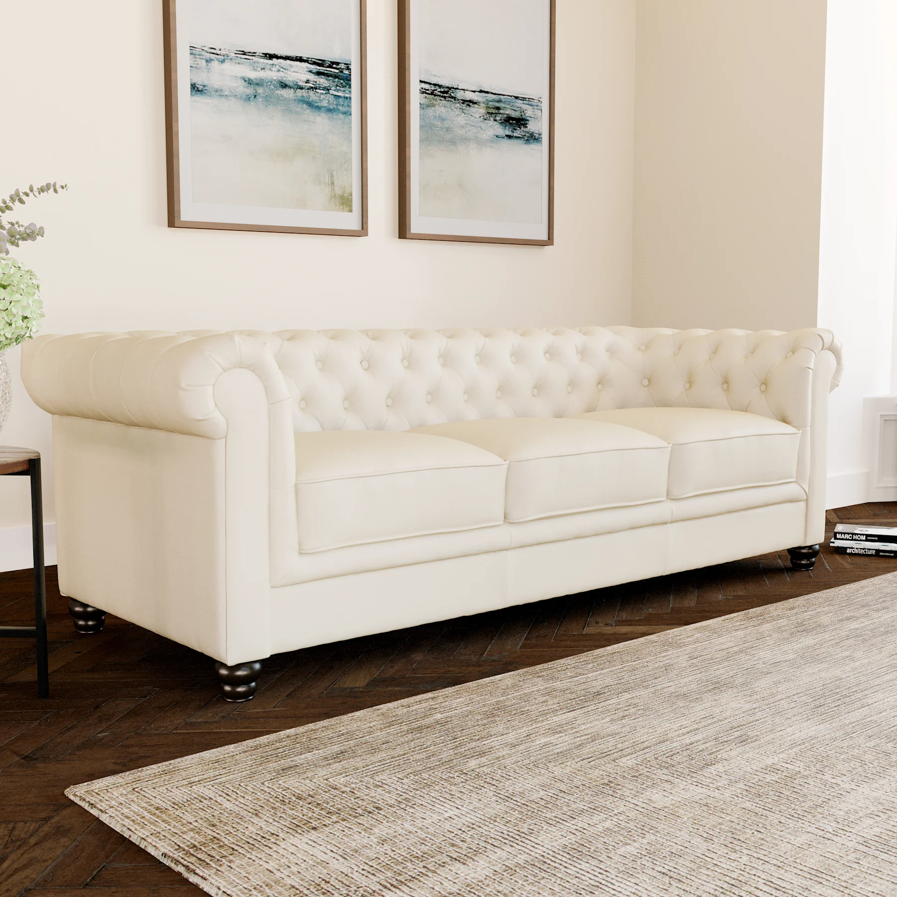 For a classic choice, you can't go wrong with a faux leather Chesterfield sofa.