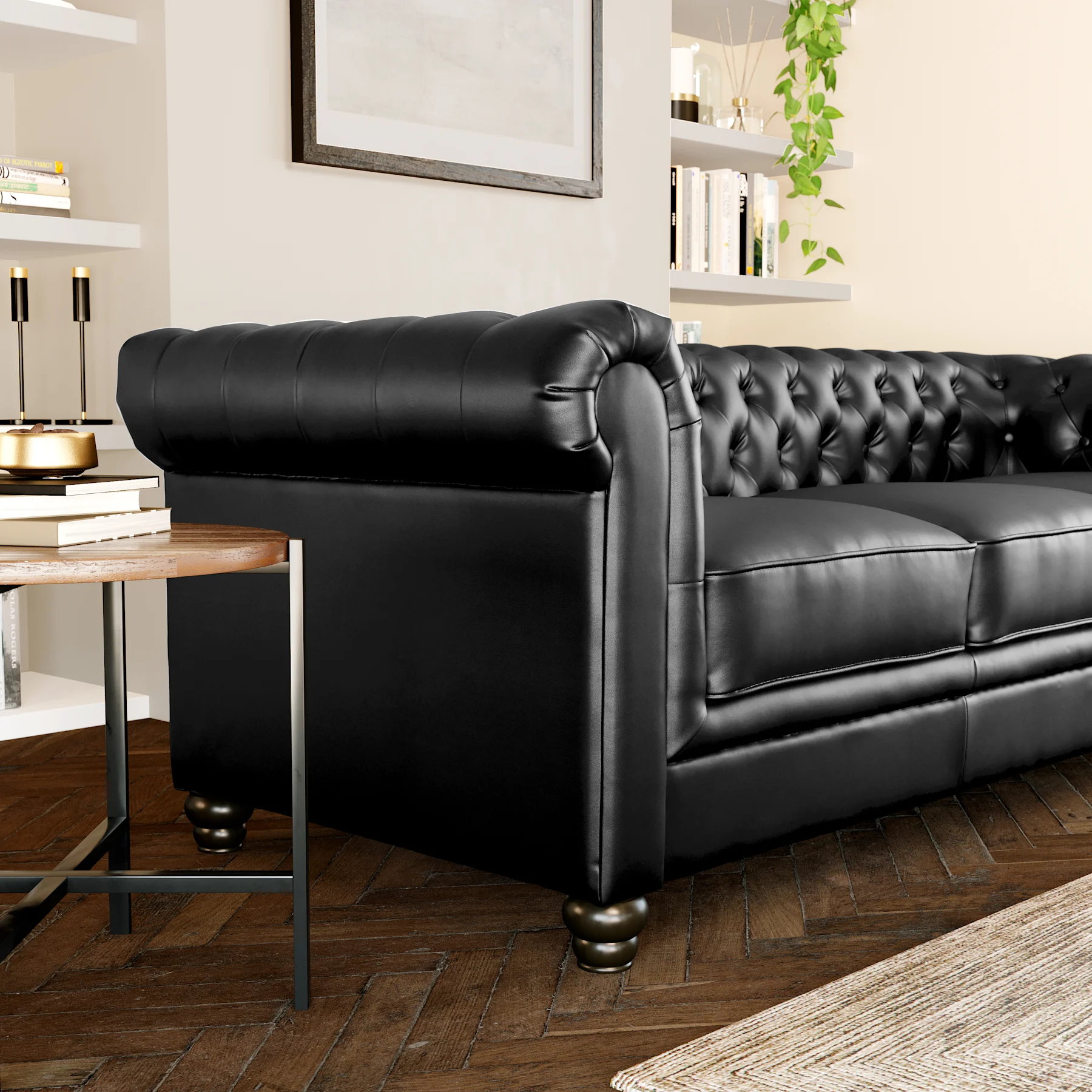 Hampton Chesterfield L-Shape Corner Sofa, Black Permium Faux Leather