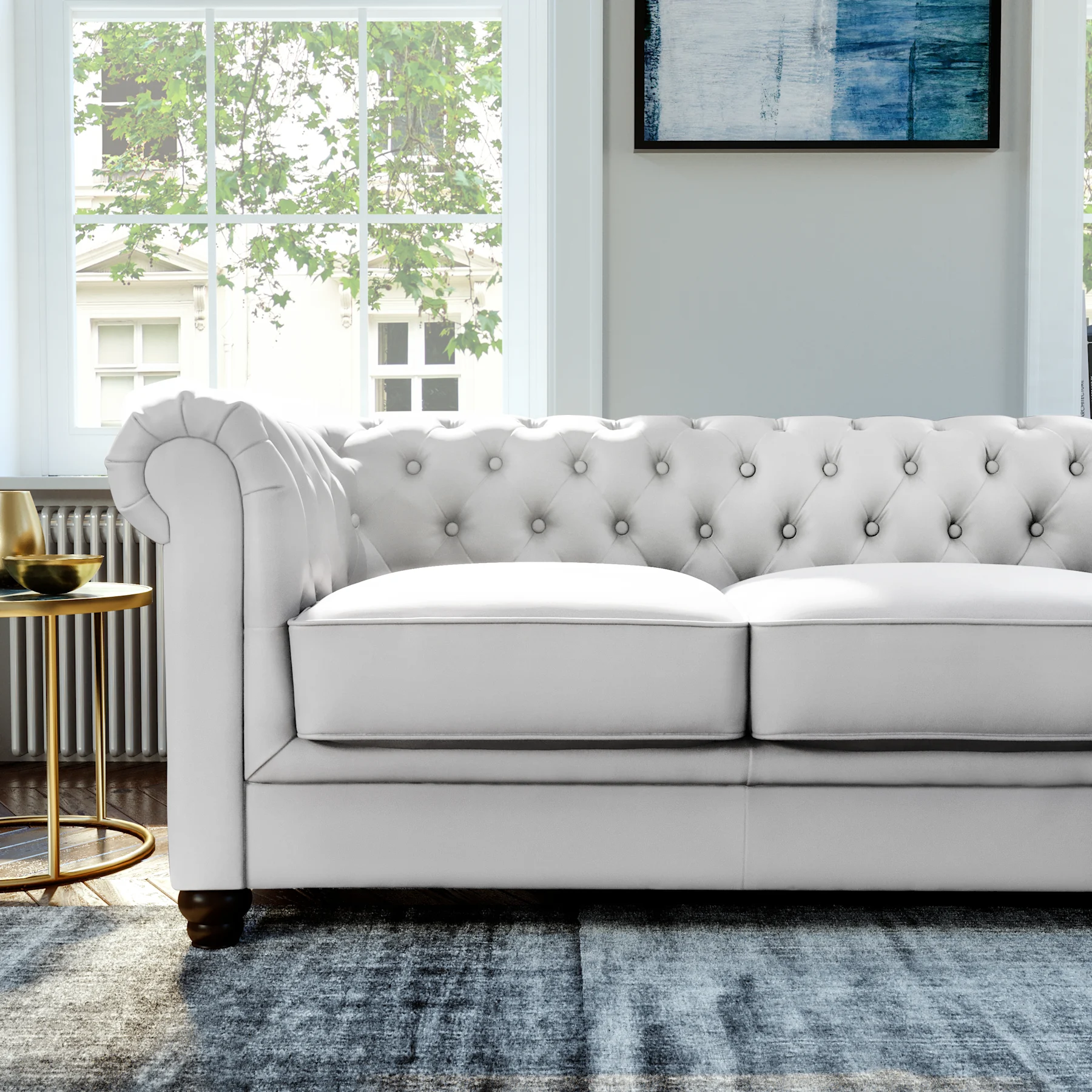 This design instantly adds a polished look with its elegant scroll arms and deep buttoned backrest.