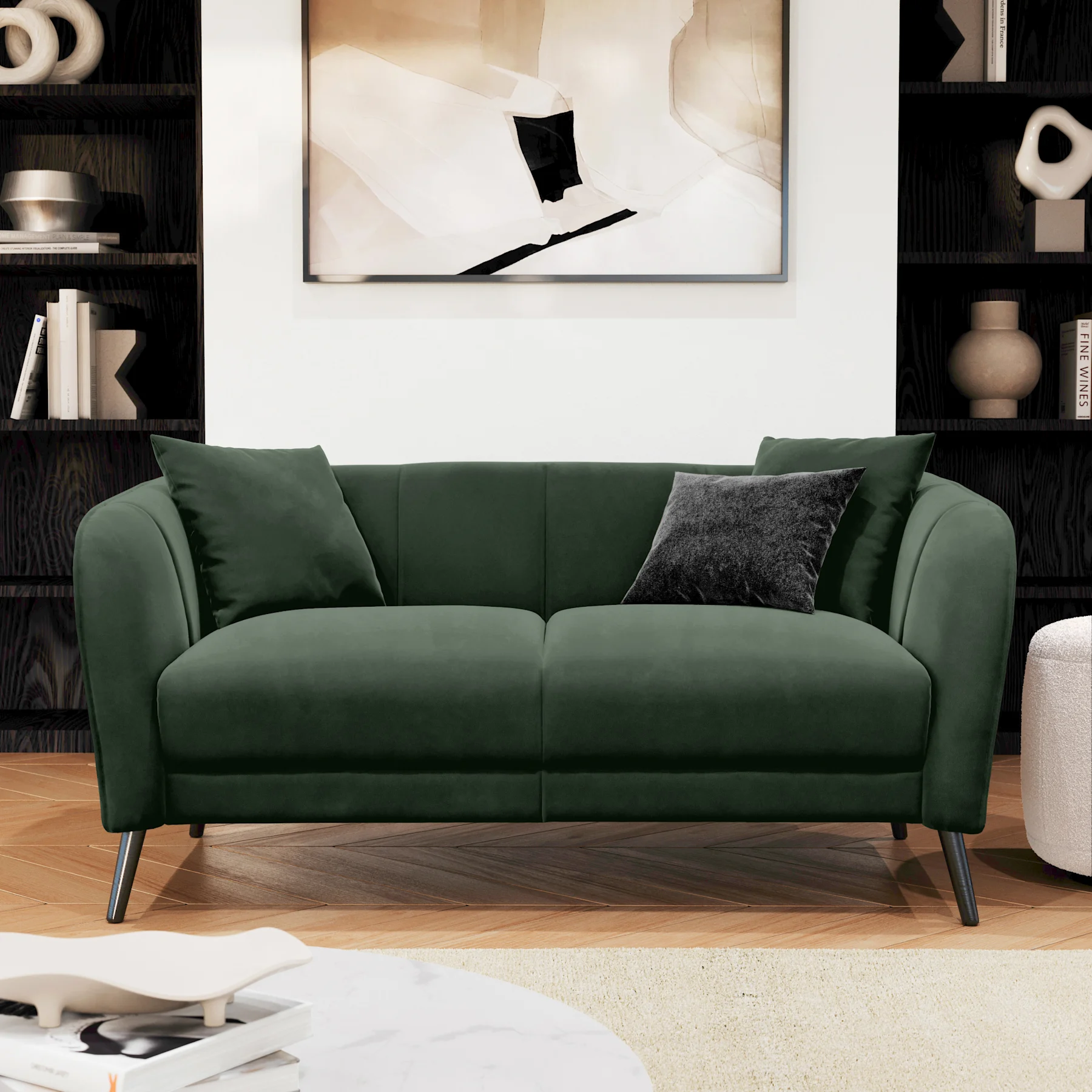 The Loren has soft, elegant curves and modern black legs.