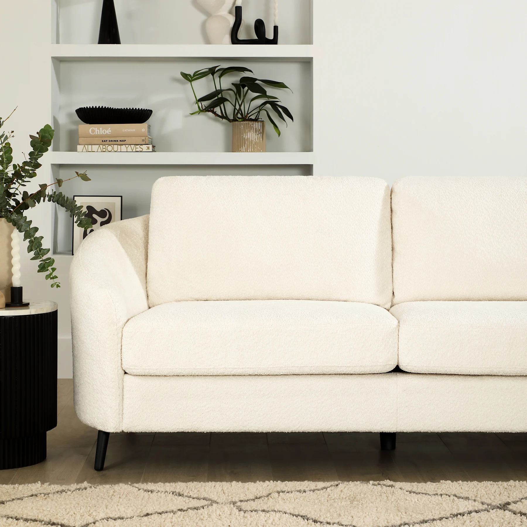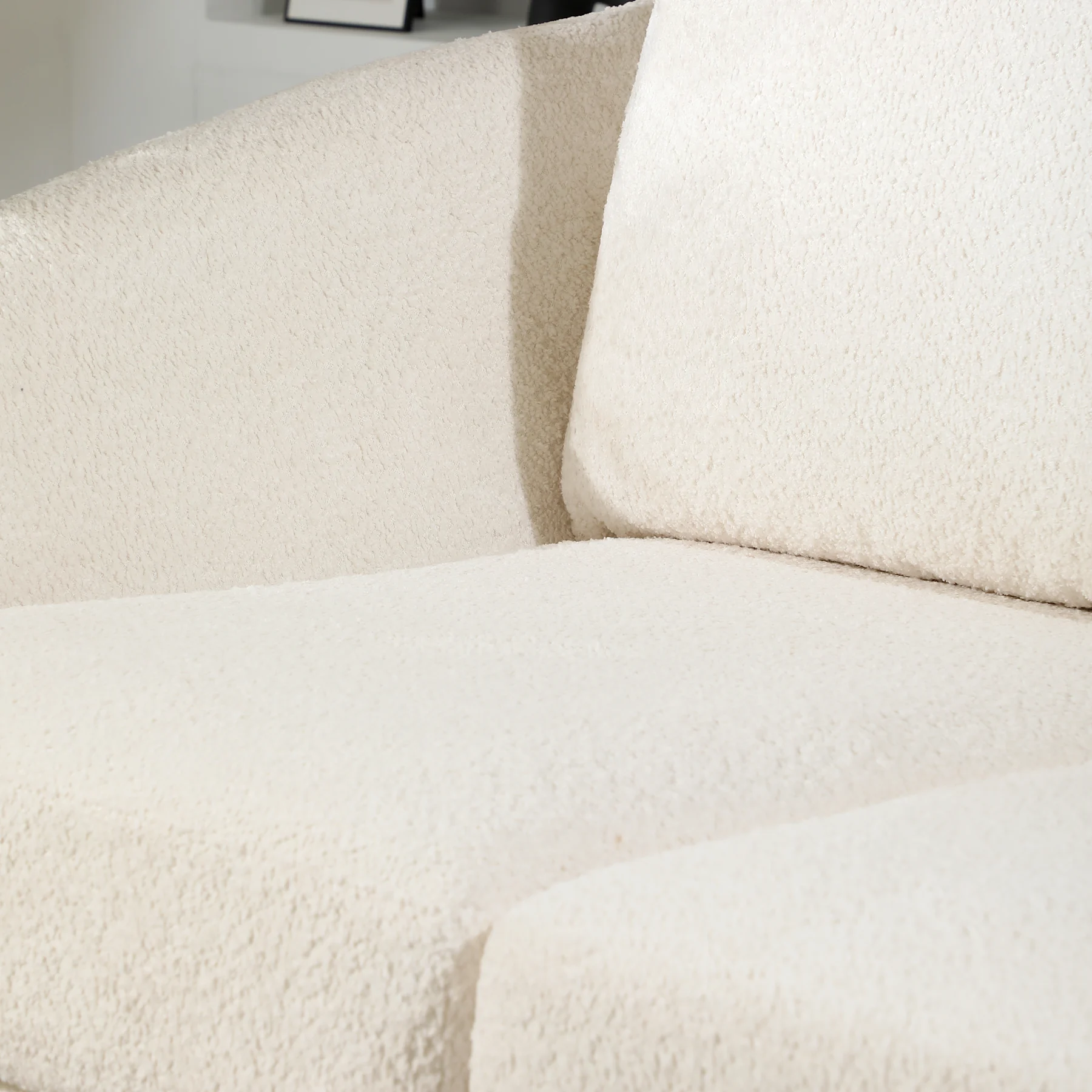 - Upholstered in soft, classic boucle
