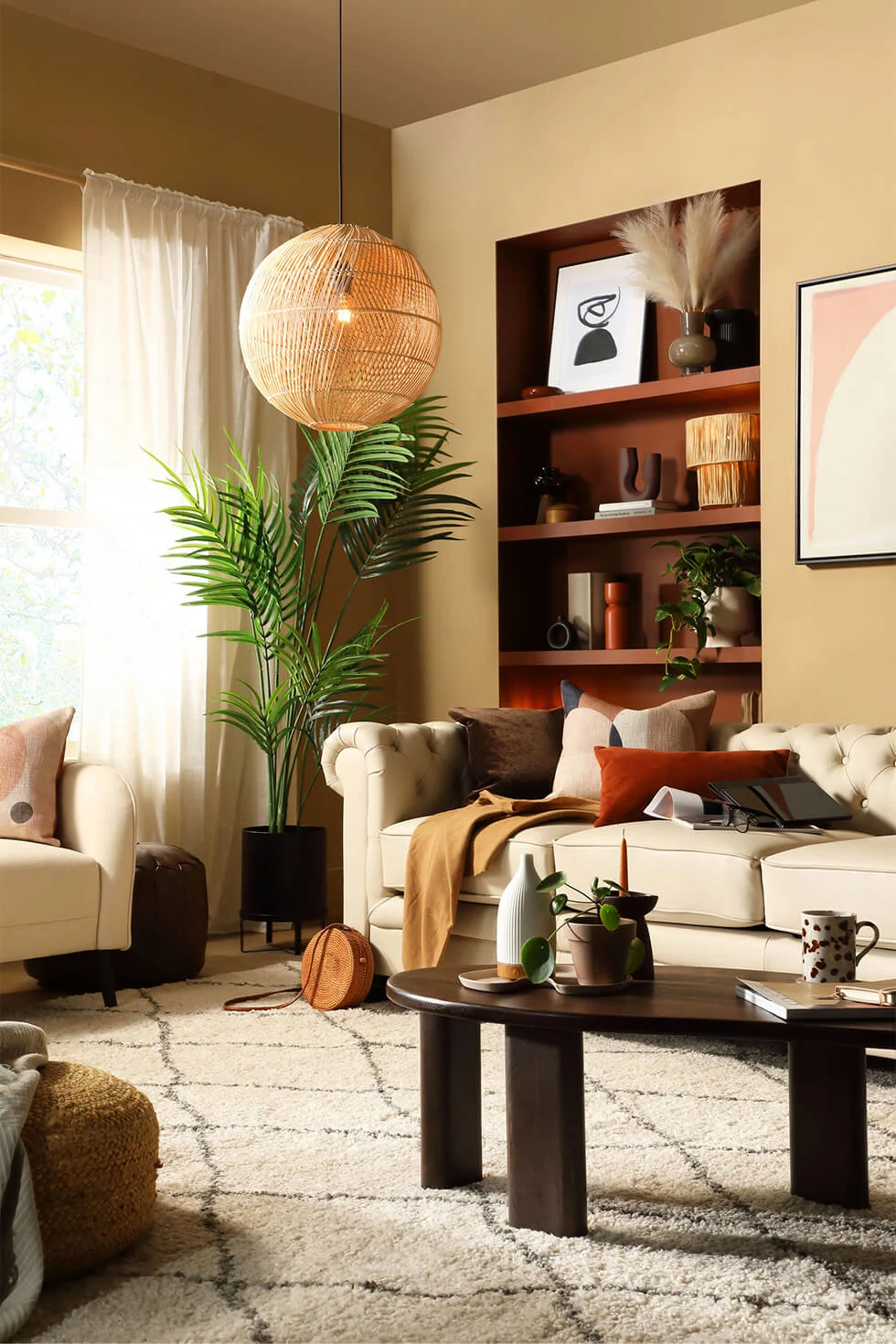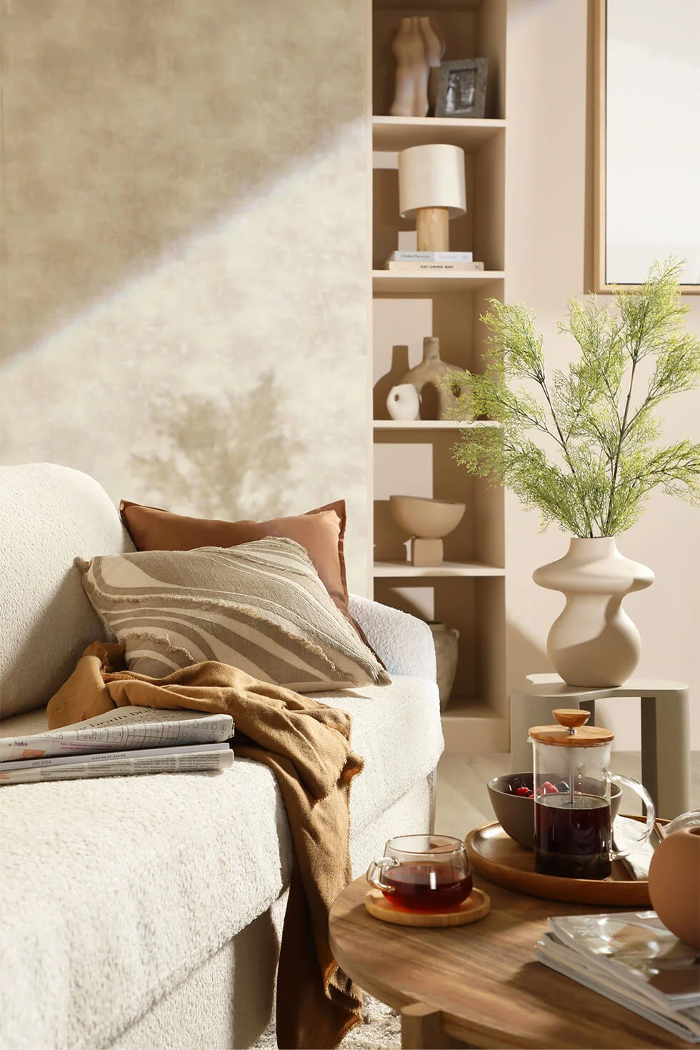 Coffee tones highlight the rise of Cafecore interiors, where you recreate the look and feel of your favourite coffee bar in the comfort of your own home. For this trend, it’s less about practical elements and more about creating the ambience — coffee tones, soft lighting, and low seating that set the vibe. When it comes to the colour palette, we’re talking about layering every coffee tone from latte beige to espresso brown, and even coffee syrup accents like vanilla and caramel shades.