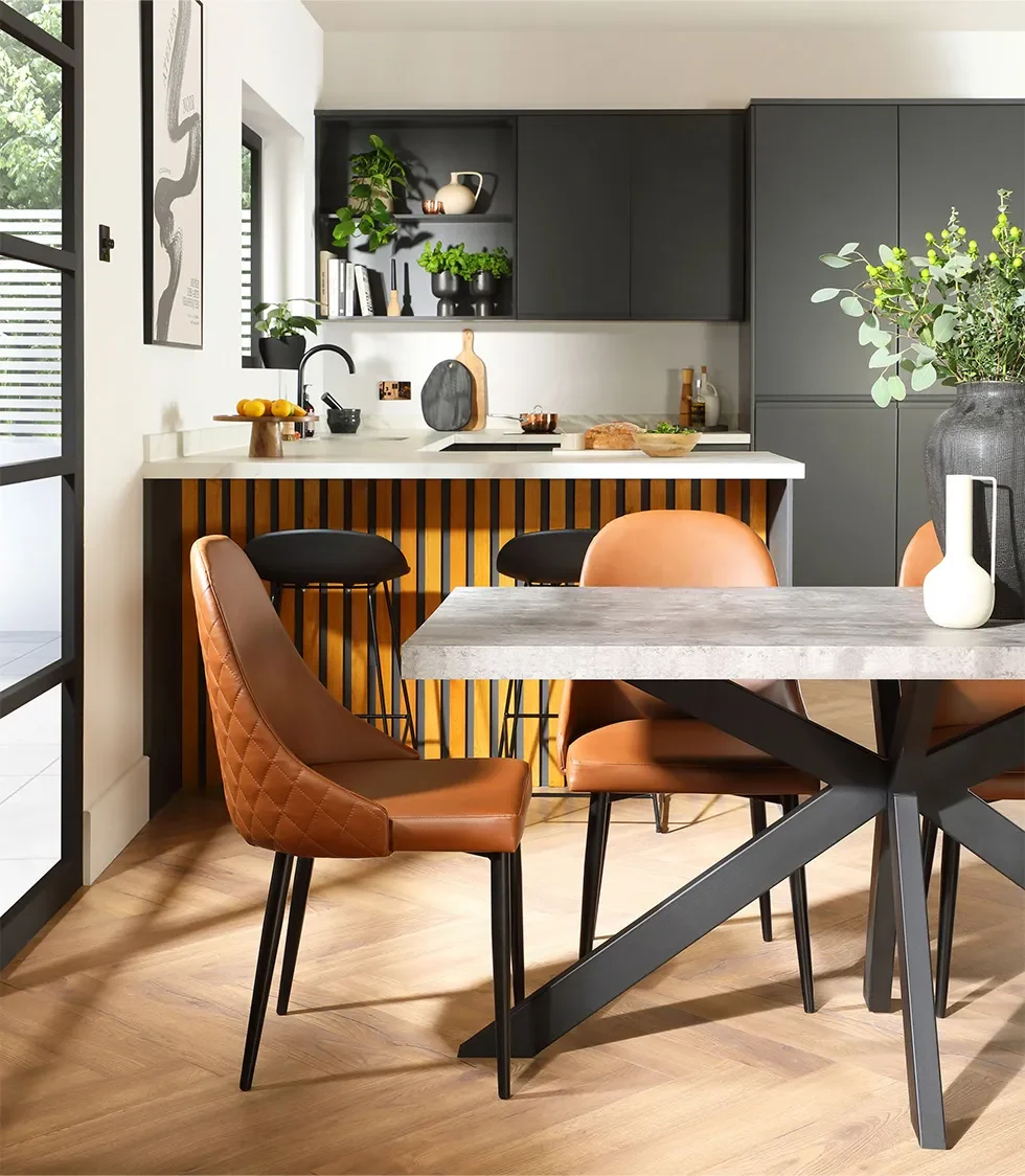 For a bigger impact, go all out with a matt black kitchen and decorate around it with wooden accents. Match the black cabinets with an industrial dining set with black legs. To avoid the look from appearing too dark, mix it up with different textures. Contrast with leather to soften the look or marble to lighten up the room.