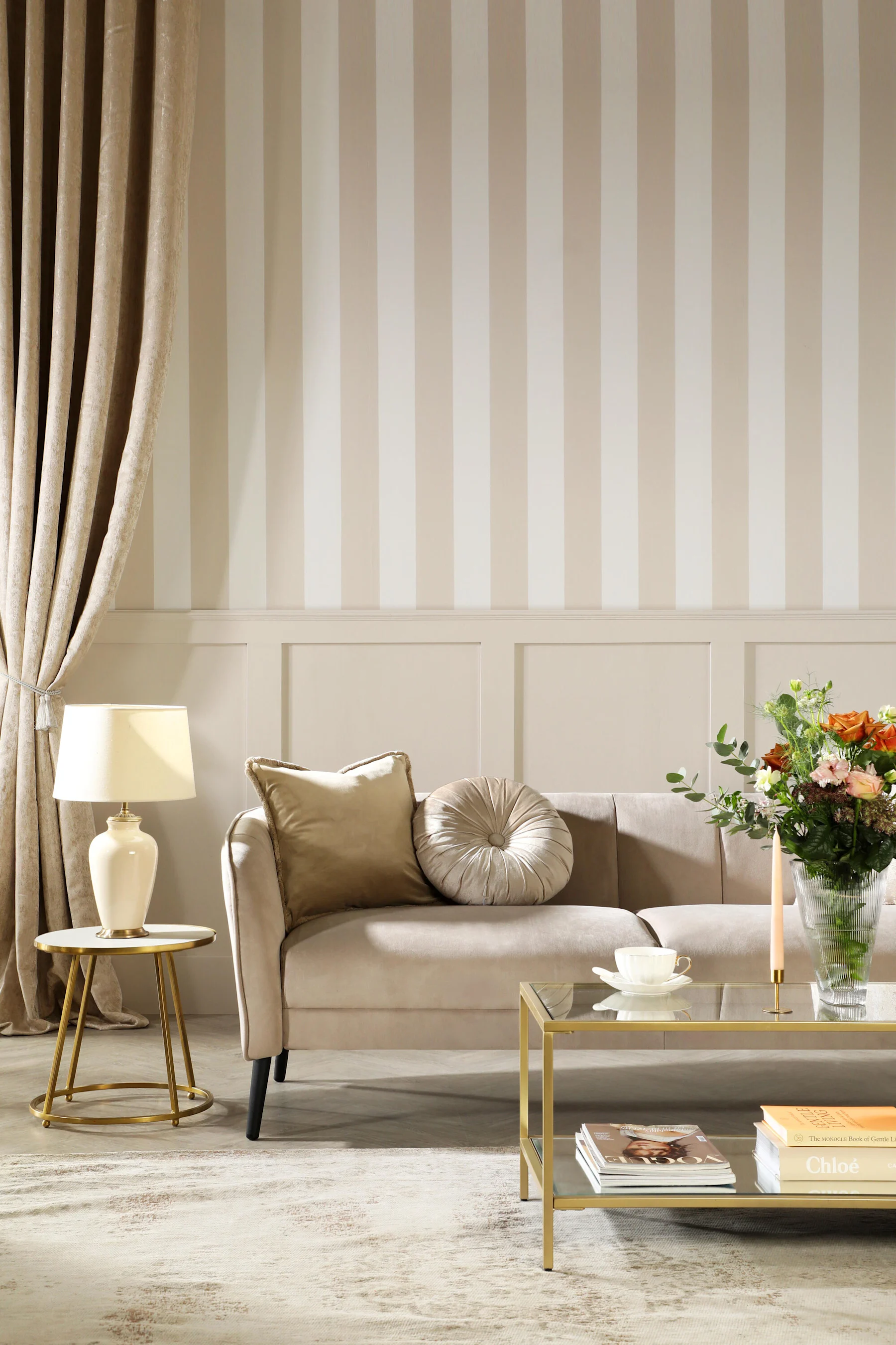 Aside from wall panelling, choosing the right wallpaper adds to the regal element, which we feel Queen Charlotte will approve. Stripes are a classic pick and complement the wall panelling, giving the space a refined feel.