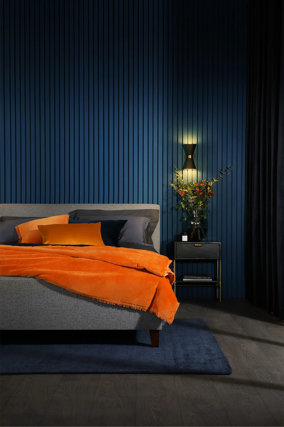 As temperatures start to dip, snuggle up in an ultra chic bedroom with bold blue walls and a contemporary grey fabric bed. “Dark walls create a cocooning effect for an irresistibly cosy space,” explains Rebecca. “Add texture with a wood slat feature wall in navy for a striking look that still feels relaxing.” Bring in the colours of bright autumn leaves with orange bedding and recreate a soft autumn glow using warm ambient lighting.