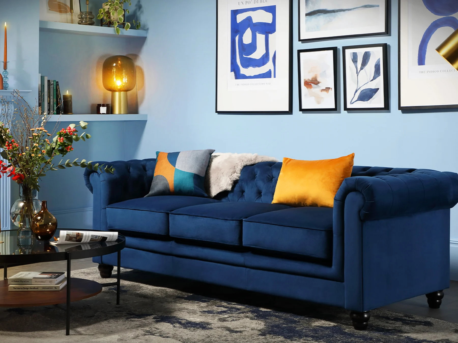 Let cool blue tones take centre stage this autumn. In the living room, start with light blue walls as a relaxing neutral. Then add richness in both colour and texture with a statement Chesterfield sofa in royal blue velvet. “Reach for lush autumnal hues to warm up the space – think earthy browns and golden yellows through accessories and seasonal blooms.” suggests Rebecca. Layer cosy comforts that add softness, like cushions and a faux sheepskin throw. Keep the overall look modern and stylish with black accents and metallic gold accessories.
